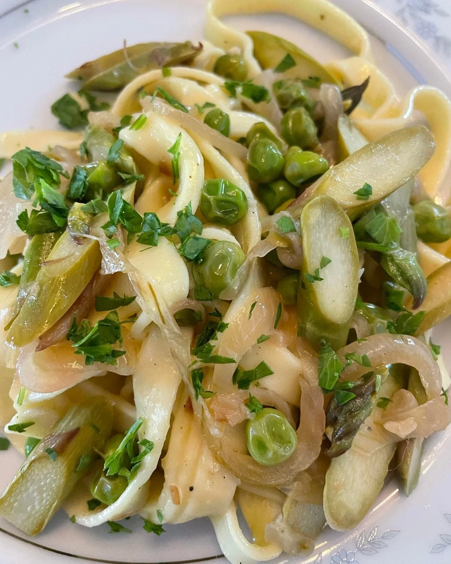 Start with a hot cauldron. Add high quality EVOO, then sweat your onions. I like them sweet, so I saute until almost caramelized, then add garlic and sweat that allium, too. Add a lot of white wine and reduce to almost nothing. Not “almost nothing”, almost “almost nothing”. Finish by adding the peas and asparagus, along with the lemon juice and let everything simmer and steam until the veg is at your desired tenderness. I like a more al dente experience, so I reduce my white wine much more before adding the veg. That gives me just about 60 seconds before I thicken the sauce with the best European style butter. Salt and pepper to taste. We ate this on a bed of fresh fettuccine, garnished with shaved parmesan and chopped parsley.
