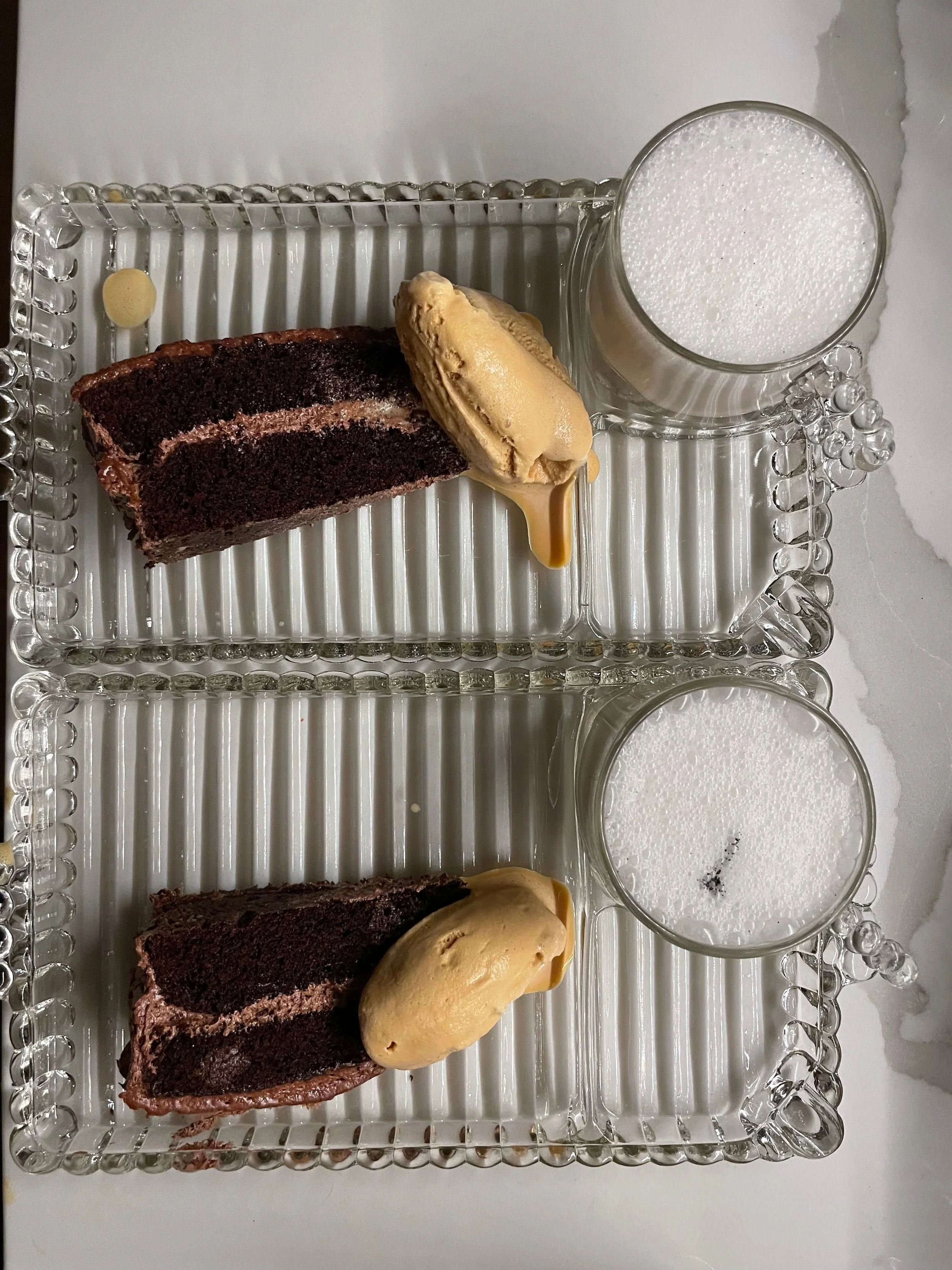 Chocolate cake with Birtite brand’s salted caramel ice cream and cardamom “milk”