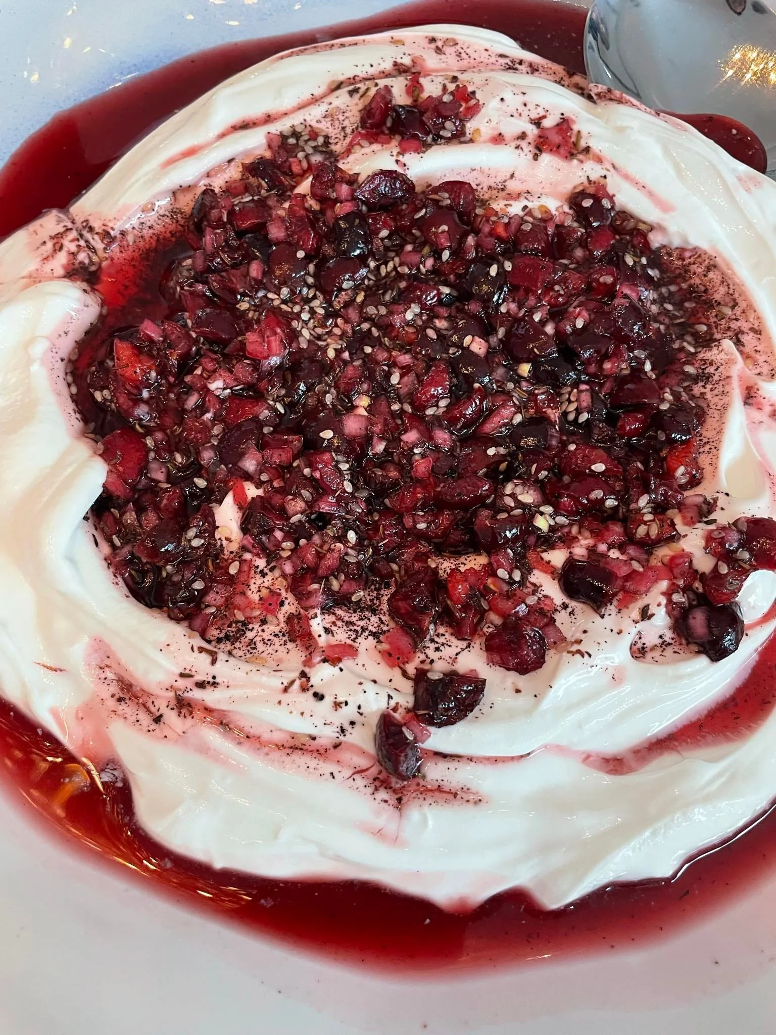 Once it is time to serve, heat sliced pita, schmear the labneh on the base of a plate and heap the steeped cherries over the top. Enjoy!